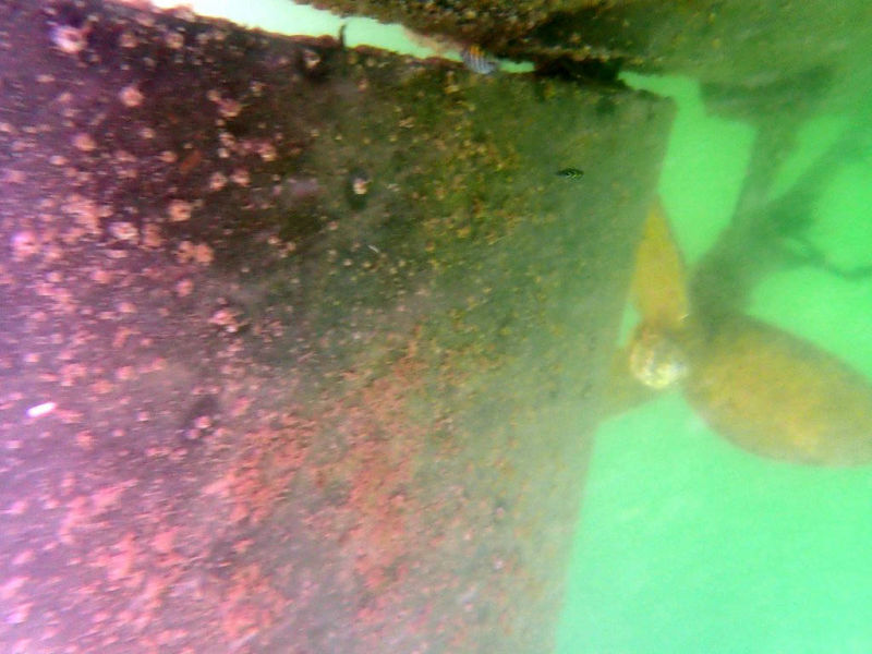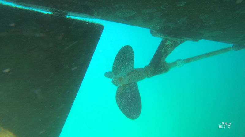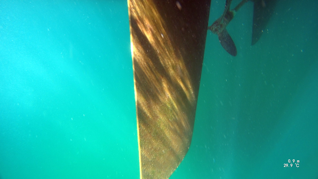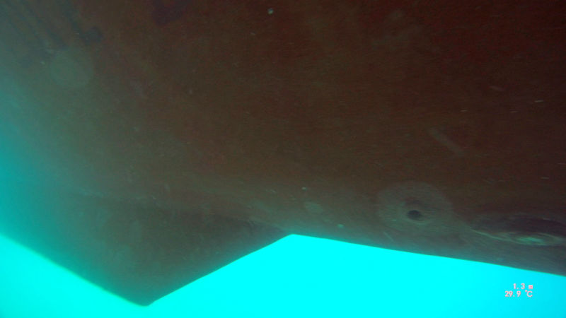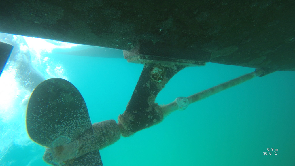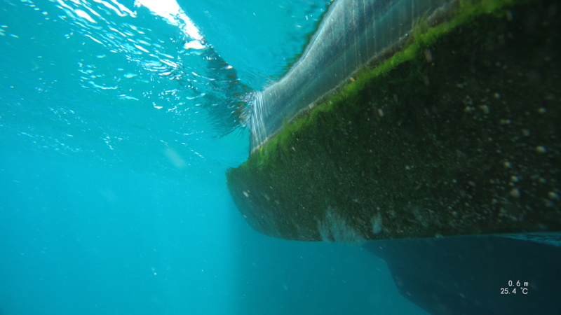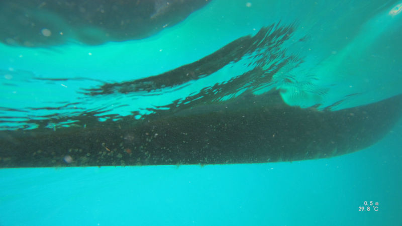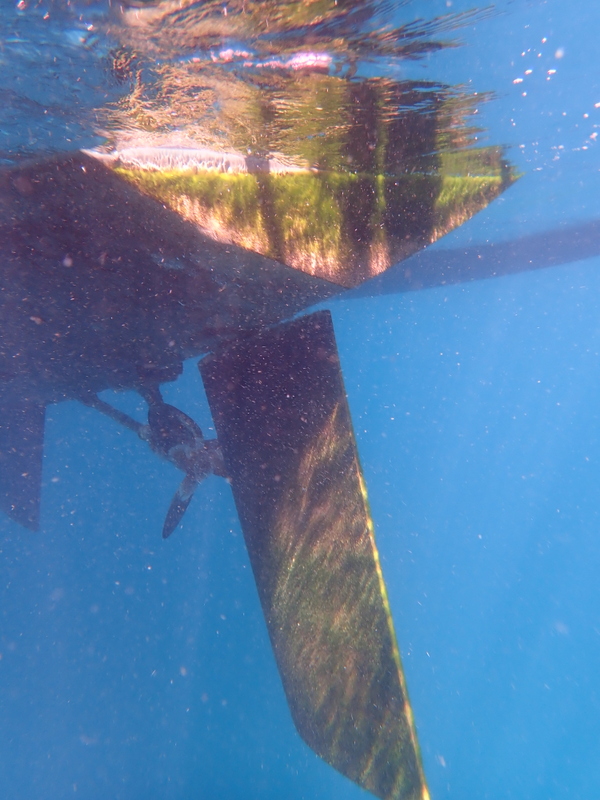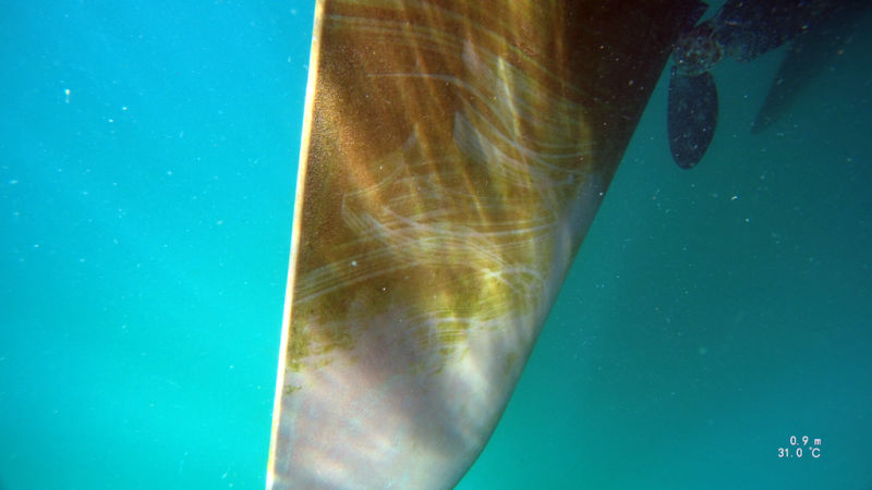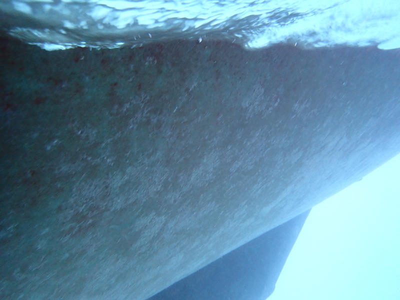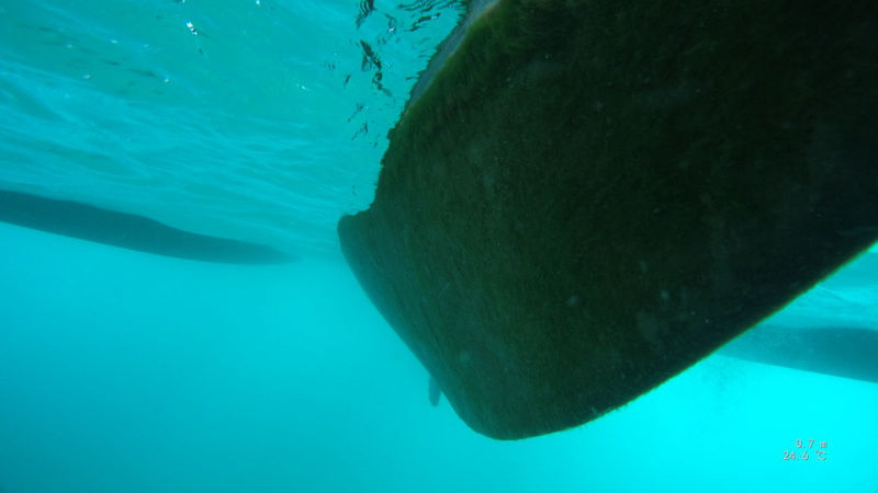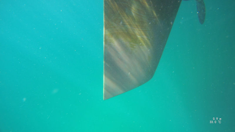 As we moved northward in the Sea of Cortez, performance seemed to improve. On August 24th we cleaned the bottom perfectly. The photos and videos below were taken exactly one month later on September 24th at Isla Partida (28º 53'N 113º 02'W). As you can see, most of the hull is in very good shape with a light coating of green slime that comes off with the swipe of a glove. There were barnacles on the stern where we always seem to have problems, and the strut, as usual, was in terrible shape. But comparing the growth to the prop and shaft, you can see that the Coppercoat is doing a good job.