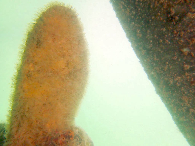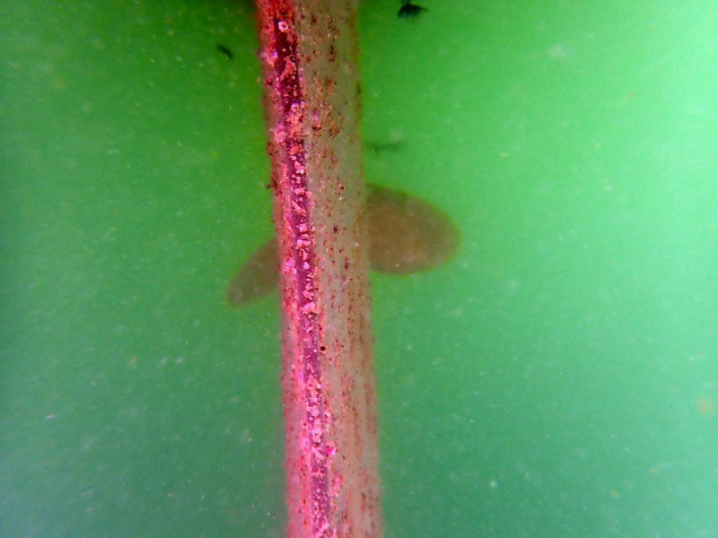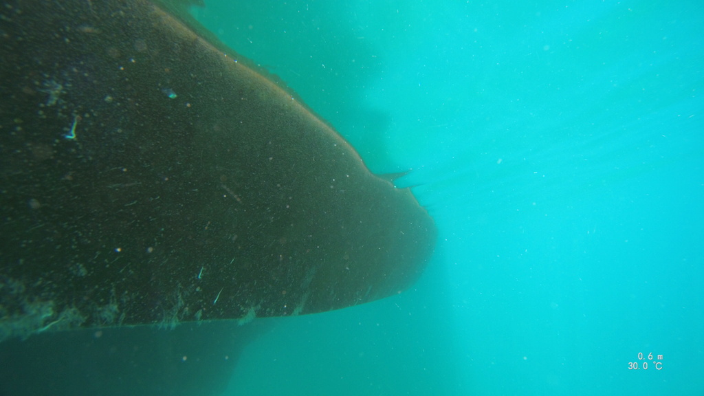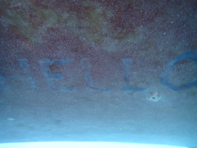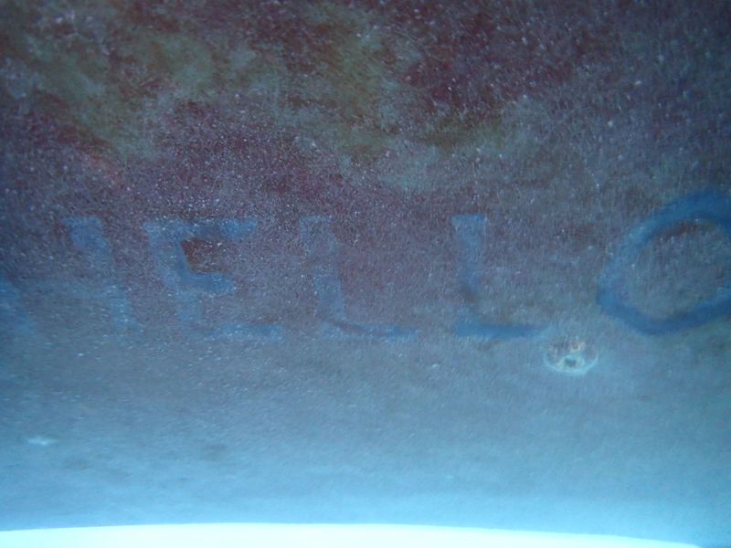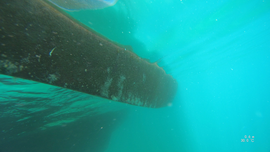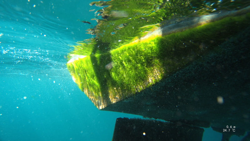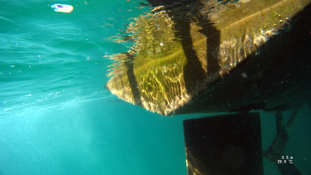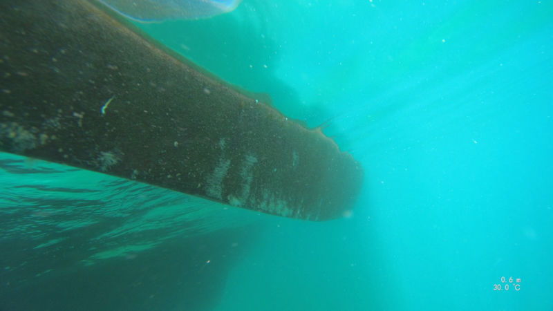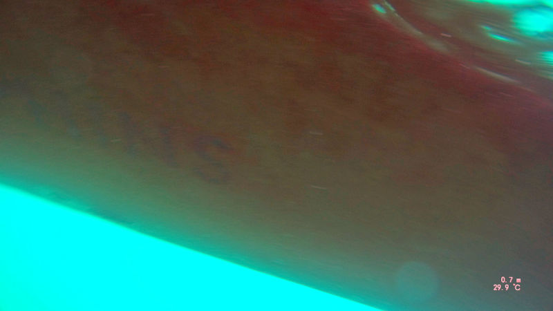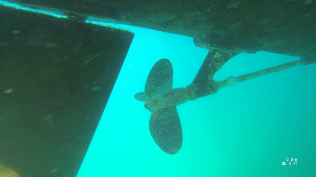 As we moved northward in the Sea of Cortez, performance seemed to improve. On August 24th we cleaned the bottom perfectly. The photos and videos below were taken exactly one month later on September 24th at Isla Partida (28º 53'N 113º 02'W). As you can see, most of the hull is in very good shape with a light coating of green slime that comes off with the swipe of a glove. There were barnacles on the stern where we always seem to have problems, and the strut, as usual, was in terrible shape. But comparing the growth to the prop and shaft, you can see that the Coppercoat is doing a good job.